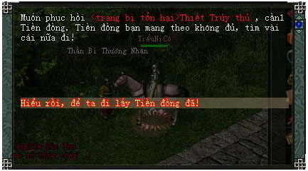 Từ những bước đầu bôn tẩu, cho đến khi đã quen thuộc từng ngõ ngách giang hồ, ai ai cũng đều cố gắng tìm cho mình những trang bị tốt nhất để thuận lợi hơn trong quá trình hành hiệp. Để chọn được một bộ vũ khí, mũ, giày, ... thật ưng ý chẳng dễ dàng gì, vì thế vô tình một lúc nào đó bạn quên sửa chữa trang bị và sau đó trang bị bị hỏng (độ bền = 0) thì quả thật không còn gì tiếc hơn.